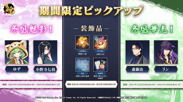 2024年12月19日(木)メンテナンス後より、『満開の道』、『深緑の道』、『冬凪魅影I』、『冬凪魅影II』、『冬凪華光I』、『冬凪華光II』を開催する。『満開の道』では新雀士「元宵(ユエンシャオ)(CV: 東山 奈央)」では、『深緑の道』では、新雀士「非名(フェイミン)」(CV: 岸尾 だいすけ)をお迎えするチャンスとなっている。また『冬凪魅影I』では、「如月 彩音」(CV: 上坂 すみれ)、「雛桃」(CV: 伊瀬 茉莉也)、『冬凪魅影II』、では、「二之宮 花」(CV: 小原 好美)、「白石 奈々」(CV: M・A・O)、『冬凪華光I』では、「ワン次郎」(CV: 小野 友樹)、「如月 蓮」(CV: 前野 智昭)、『冬凪華光II』では、「四宮 夏生」(CV: 福山 潤)、「ムーサ」(CV: 白井 悠介)を迎えるチャンスとなっているぞ。