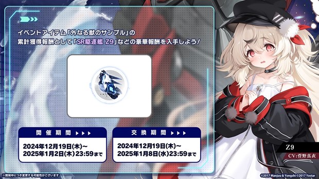 2024年12月19日(木)メンテナンス後より、期間限定イベント「星降る夕影の残光」を開催。イベントステージのクリアや毎日任務を達成することで、「外なる獣のサンプル」を獲得できる。「外なる獣のサンプル」はSSR重巡洋艦「アドミラル・ヒッパー(META)」などの報酬と交換できるほか、累計獲得数が一定数に達するとSR駆逐艦「Z9」などの報酬も入手できる。
