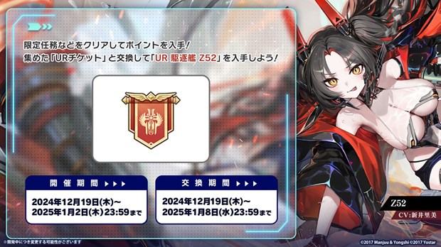 また、限定任務をクリアすることでUR駆逐艦「Z52」と交換できる「URチケット」も入手できる。イベントの遊び方や注意事項などの詳細は、ゲーム内のお知らせを確認ください。