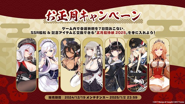 「幸運祈願」では期間中、毎日絵馬を消費し「艦船絵馬」を飾ることができる。絵馬はキャンペーン期間中1日に1回だけ加算され、飾られた絵馬によって一定時間、艦隊全体に強化効果を付与するとともに、アイテム「正月オリヅル」を入手できる。「正月オリヅル」を7羽集めると入手できる「正月招待状2025」を倉庫で使用すると、記念アイテムとともに下記艦船から一隻選択して入手できるぞ。