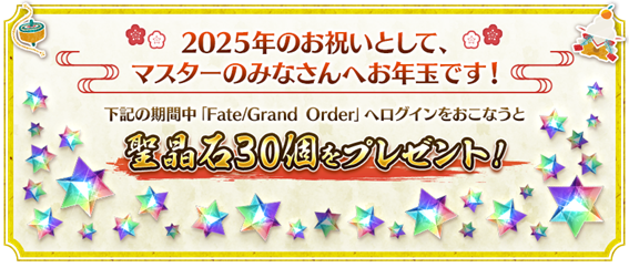期間中Fate/Grand Orderへログインしたマスター(プレイヤー)に、お年玉として聖晶石30個をプレゼント。