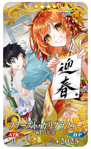 2025年1月1日(水)・2日(木)・3日(金)の各日0時に、Fate/Grand Order公式X(Twitter)にて、「2025年お正月キャンペーン」のキャンペーンポストを投稿。このキャンペーンポストのリポスト数が2025年1月3日(金)23:59までに合計10万リポストを達成すると、すべてのマスター(プレイヤー)にお正月限定概念礼装「★4(SR)ファースト・カリグラフィー」1枚と「2,025万QP」をプレゼント!
