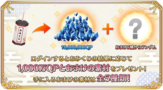 恒常の連続ログインボーナスを受け取る際に、お正月三が日限定でその日の運勢によって「1,000万QPと5種類の中からいずれかのおまけの素材が追加」される「おみくじボーナス」を実施する。