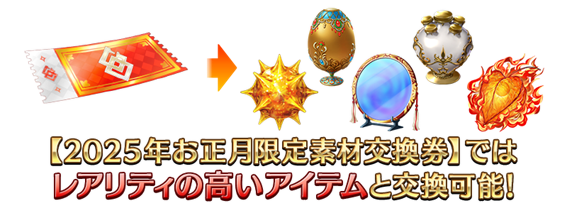 期間中、「マスターミッション」の「限定」の項目内に「2025年お正月限定素材交換券」が入手できるミッションが追加される。「2025年お正月限定素材交換券」では、通常の素材交換券で交換できるアイテムよりもレアリティの高いアイテムが交換可能になる。