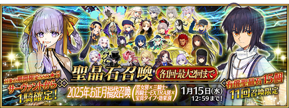 2025年1月1日(水)0:00から1月15日(水)12:59までの期間限定で「ニューイヤー2025ピックアップ召喚」(以下、本召喚)を開催する。2025年を迎えたことを記念し、新しく登場した期間限定サーヴァント「★5(SSR)リチャードⅠ世」と期間限定概念礼装「★5(SSR)明けの光暈」「★4(SR)春待つ君と」「★3(R)遺跡を荒らす者」をピックアップする。さらに今回は、期間限定サーヴァント「★5(SSR)蒼崎青子」「★5(SSR)曲亭馬琴」「★5(SSR)高杉晋作」「★5(SSR)宮本武蔵(バーサーカー)」「★5(SSR)坂本龍馬(ランサー)」「★5(SSR)ミス・クレーン」「★5(SSR)久遠寺有珠」「★4(SR)美遊・エーデルフェルト」「★4(SR)クロエ・フォン・アインツベルン(アヴェンジャー)」「★4(SR)斎藤一」「★4(SR)カラミティ・ジェーン」と、ストーリー召喚サーヴァント「★4(SR)エミヤ〔オルタ〕」「★4(SR)李書文(ランサー)」「★4(SR)加藤段蔵」をピックアップする7種類の召喚を期間毎に切り替わりで開催する。