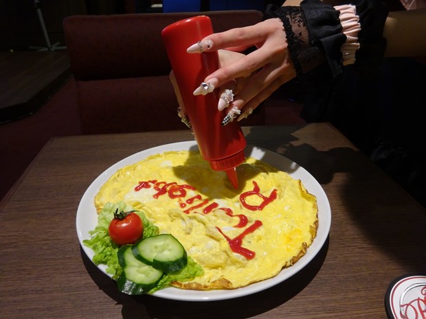 そしてオムライスが到着。あれ?プレーンなの?…と思っているとお絵かき道具を持って候補生が登場!後輩の描くオムライスを楽しもう!