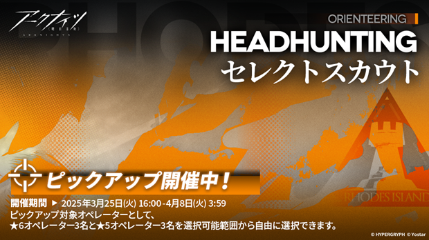 期間中、当期【セレクトスカウト】のピックアップオペレーターとして、★6オペレーター3名と★5オペレーター3名を選択可能範囲から自由に選択できる。