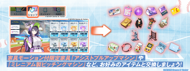 本イベントでは、ステージをクリアすると、イベント専用アイテムの「イベントPt」、「応援バルーン」、「プロテインドリンク」を集められ、「イベント報酬交換所」で「抽選券」や、家具モーション付き限定家具「アシストプルアップマシン」、「ミレニアム製ピッチングマシン」などの報酬と交換できる。また「イベントPt」は、累計獲得数に応じて様々なアイテムを入手することも可能だ。