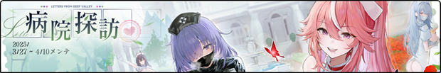 2025年3月27日(木)メンテナンス後より、期間限定イベント「病院探訪」を開催する。イベントステージをクリアすることでイベントアイテム「病院情報」が集められ、累計獲得数に応じて限定装備外装などの報酬を入手できる。