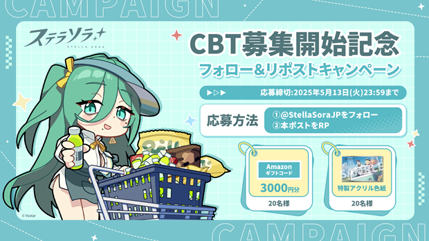 『ステラソラ』公式X(旧Twitter)にて、Amazonギフトコードや特製アクリル色紙が抽選で当たる「CBT募集開始記念 フォロー&リポストキャンペーン」を開催する。