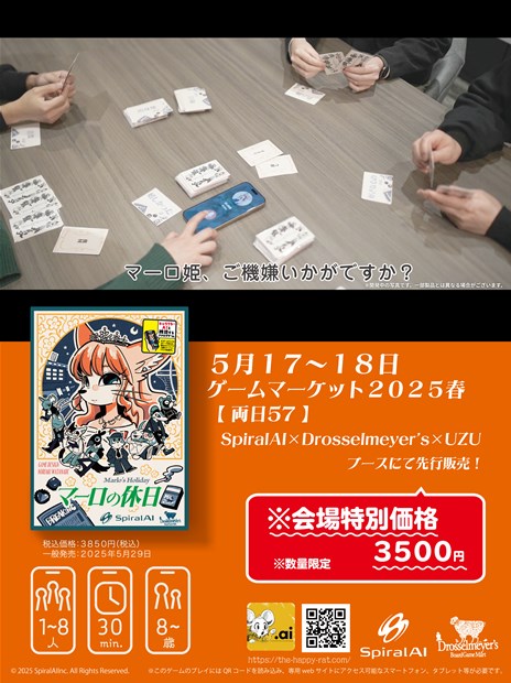 『マーロの休日』は、2025年5月17日(土)・18日(日)にゲームマーケット2025春にて、数量限定で先行販売予定だ。【両日57】SpiralAl × Drosselmeyer’s × UZUブースにて、会場特別価格 3,500円(税込)でお求めいただける。イベントの詳細は、ゲームマーケット公式サイト(https://gamemarket.jp/)をご確認ください。
