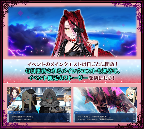 本イベントでは、ストーリーを楽しめるメインクエストが日ごとに開放されるほか、メインクエストをクリアしていくと、イベントアイテムを集められるフリークエストもあわせて開放される。また、イベントを進めていくとテュフォン・エフェメロスと共に特異点を解決することになり、「改修クエスト」をクリアすることでテュフォンの竜体を修復・強化していくことができる。選んだ「改修クエスト」によって、イベントのバトル中にさまざまな効果を発揮する純血竜スキルおよび純血竜アシストの内容が変化していく。なお、本イベントのシナリオは、「ロード・エルメロイⅡ世の事件簿」の原作者であり、過去に開催した期間限定イベント「聖杯戦線~白天の城、黒夜の城~」などのシナリオを手掛けられた三田誠氏にご執筆いただいた。
