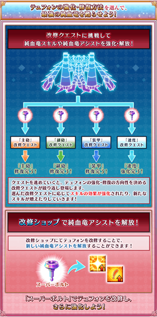本イベントでは、バトル開始時に純血竜アシストが自動で発動するほか、特定のバトルではマスタースキルにかわって純血竜スキルを使用することができる。純血竜スキルは「改修クエスト」をクリアすることで、対応したスキルを解放または強化することができる。純血竜アシストは「改修クエスト」をクリアすると強化・解放されるほか、改修ショップにて新しい純血竜アシストを解放することができる。「改修クエスト」についても、材料収集ポイント報酬で獲得した「スーパーボルト」を消費して挑戦できる。