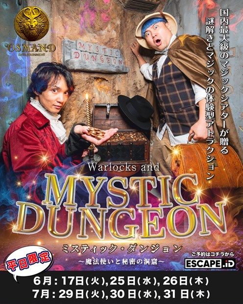 OSMANDエンターテインメントが運営する、世界で活躍する一流マジシャンのみが出演する日本最高峰のマジックシアター「MAHOU Dining Bar OSMAND」は、日本最大の謎解きとマジックの体験型アトラクション『ミスティックダンジョン』を大好評につき、6月・7月も開催することが決定! 日程は2025年6月17日(火)、25日(水)、26日(木)、そして7月29日(火)、30日(水)、31日(木)を予定している。予約はWEBサイト(https://escape.id/org/OSMAND/event/MysticDungeon2504)から行おう! すでに一部日程では締め切り間近もあるので早めに予約をして楽しもう! 今期の『ミスティックダンジョン』は、壁画に描かれた謎や魔法の洞窟内に仕掛けられた様々な秘密を解き明かしつつ、特別なマジックショーを楽しむことができる新感覚エンターテインメントで、多くのマジック・謎解きファンの方々に愛されている体験型アトラクションだ。毎回、完売日が続出! のオズマンドの人気アトラクションを是非体感してほしい!