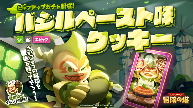 「クッキーラン」シリーズの新作スマートフォン向けゲーム『クッキーラン:冒険の塔』において、2025年6月12日(木)メンテナンス後より、ピックアップガチャにて、「バジルペースト味クッキー」がピックアップ中。