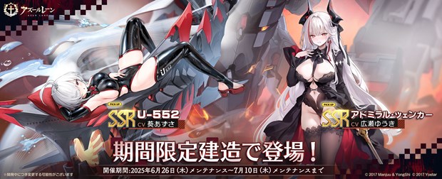 2025年6月26日(木)メンテナンス後より、SSR巡洋戦艦「アドミラル・ツェンカー」とSSR潜水艦「U-552」の鉄血陣営新規艦船2隻が登場する期間限定建造を開催。この機会にぜひお迎えください!