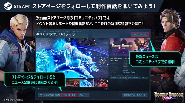 『ダブルドラゴン リヴァイヴ』Steamストアページから確認できる「コミュニティハブ」にて、プレスリリースや公式サイトには掲載されていない小話を投稿中だ。海外のイベント参加レポートや開発ウラ話など、本作の発売が待ちきれない方へ向けた情報をお届け! ストアページ内の「フォローする」ボタンを押下のうえ、「コミュニティハブ」から是非チェックしよう!