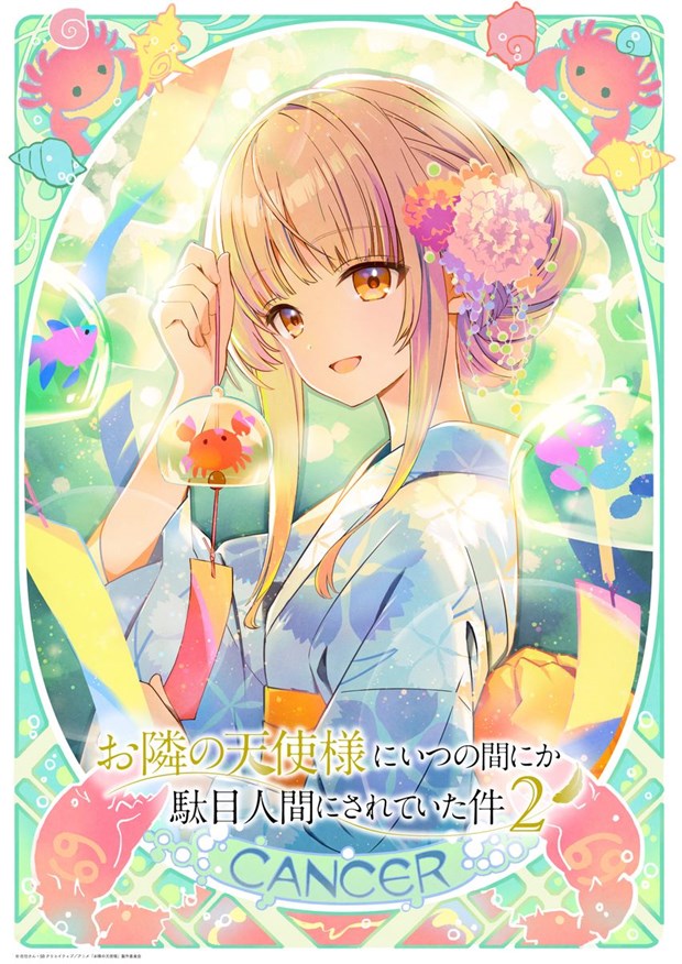 「小説家になろう」にて2018年12月より投稿され、GA文庫(SBクリエイティブ刊)にて刊行中の大人気ライトノベル『お隣の天使様にいつの間にか駄目人間にされていた件』(著:佐伯さん イラスト:はねこと)。それを原作としたアニメが2023年1月より第1期が放送され、第2期の制作が決定している本作。2025年5月より始まった細居美恵子描き下ろしによる星座ビジュアルの第2弾が公開となった。第2弾はかに座ということで、カニの絵柄が入った風鈴を持つ浴衣姿の真昼になる。TVアニメ第2期は鋭意制作中なので、原作・アニメ共にますます盛り上がりをみせる本作をお楽しみに!