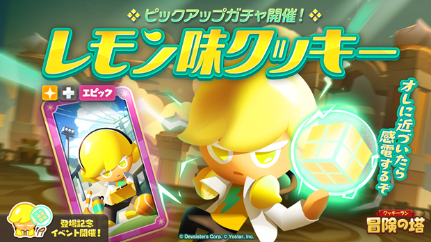 株式会社Yostar(代表取締役 李 衡達 / 所在地:東京都千代田区)は、デヴシスターズ(株)(代表 チョ・ギルヒョン / 所在地:韓国ソウル市)が開発する「クッキーラン」シリーズの新作スマートフォン向けゲーム『クッキーラン:冒険の塔』において、「レモン味クッキー」のピックアップガチャの開催を発表した。
