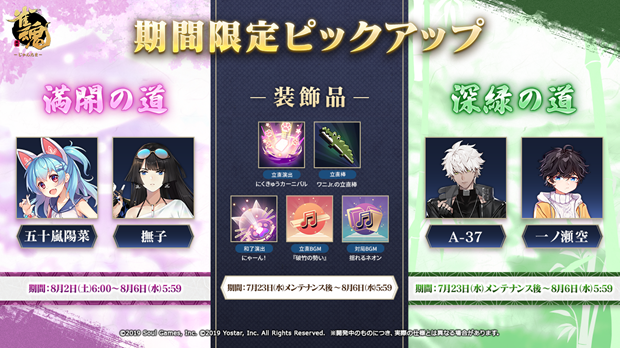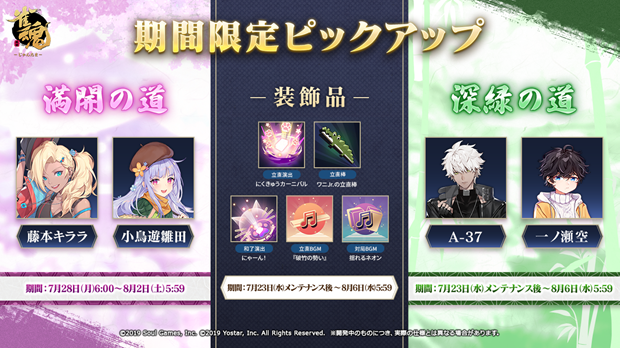 2025年7月23日(水)メンテナンス後より、期間限定ピックアップ『満開の道』、『深緑の道』を開催。特定雀士の出現確率が期間限定でアップしますので、ぜひこの機会にお迎えください。