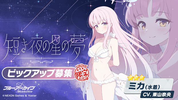・★3「ナギサ(水着)」、★3「ミカ(水着)」、★3「ヒナ(ドレス)」及び、本ピックアップ募集への追加対象の生徒は次回以降の「ピックアップ募集」、および「通常募集」ではお迎えすることができません。