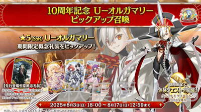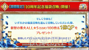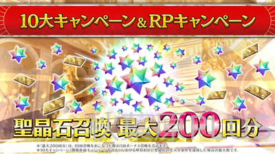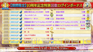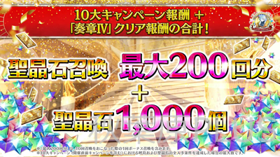 そして最大もらえる数は聖晶石召喚200個+聖晶石1000個の大盤振る舞いとなった。10周年だからこそだ!