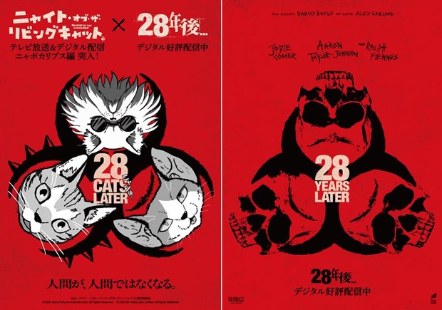 世界猫の日の本日8月8日に映画『28年後…』とのコラボが決定した。『28年後…』は、世界中を震撼させた『28日後…』のその後を描く、衝撃のサバイバル‧スリラー作品。先日2025年8月6日よりデジタルプレミア配信もスタート。コラボを記念しましてコラボビジュアルおよび特別コラボ映像が発表とニャった。特別コラボ映像ではクナギ(CV.水中雅章)&カオル(CV.上田麗奈)のニャレーション(ナレーション)も。感染者と猫が出会うとき、世界はどうニャるのか…!? さらに、TVアニメ化記念ミニ展示が開催中の京都国際マンガミュージアムにて、「京都国際マンガ・アニメフェア(京まふ)2025」の開催期間である2025年9月21日(日)に監督の神谷智大さん、シリーズ構成の入江信吾さん出演のスペシャルトークショーの開催が決定した。そして、ABEMAでは2025年8月12日&13日に1話~最新話までを無料で楽しめる『ニャイト・オブ・ザ・リビングキャット』の振り返り一挙放送が決定。これまでお楽しみいただい皆様には振り返ってご視聴いただきつつ、まだご覧いただいていない皆様にはここまでの話数を一気にお楽しみいただける機会になっている。2025年8月の放送・配信回より、いよいよ猫に世界が支配された後の世界を描く新章「ニャポカリプス編」に突入! 新章突入記念として、同じく“感染者”に支配された後のイギリスを描く映画『28年後…』とのコラボが決定。猫愛満載のニャンデミック・コメディと命がけのパンデミック・スリラー! 異色のタッグによるシュールでインパクト大のコラボビジュアル&特別コラボ映像を、ぜひご覧ください !