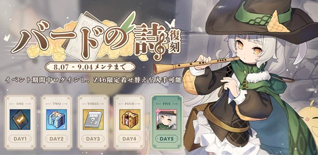 イベント期間中、ゲームにログインしてイベントバナーのボタンをタップすると、5日目にZ46の着せ替え「バード・ハーメルン」を入手できる。ぜひお見逃しなく!