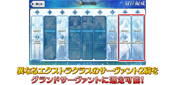 エクストラクラスのサーヴァントは、エクストラⅠ(ルーラー、アヴェンジャー、ムーンキャンサー、シールダー)もしくはエクストラⅡ(アルターエゴ、フォーリナー、プリテンダー、ビースト)から2騎をグランドサーヴァントとして選定し、冠位を戴冠させることができます。
