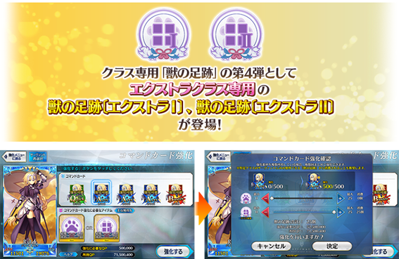 コマンドカードの強化に使用する「獣の足跡」にクラス専用のアイテムを追加。クラス専用の「獣の足跡」は対応するクラスのサーヴァントにのみ使用でき、通常の「獣の足跡」と同様の効果を得ることができる。