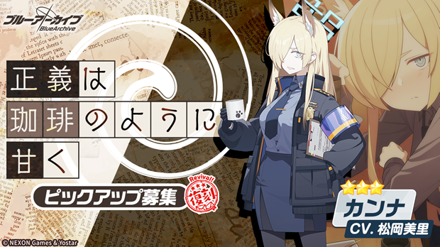 2025年8月13日(水)11:00より、復刻ピックアップ募集「正義は珈琲のように甘く」、復刻ピックアップ募集「元宮チアキは見逃さない」を開催する。ヴァルキューレの公安局で局長を務める「カンナ」さんと、「万魔殿」の書記である「チアキ」さんのピックアップ募集になる。