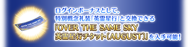 特別概念礼装「英霊星行」の「九州ブロック」全16種類の中からお好きな1枚と交換できる「OVER THE SAME SKY 英霊星行チケット〔AUGUST〕」が手に入るログインボーナスを実施する。