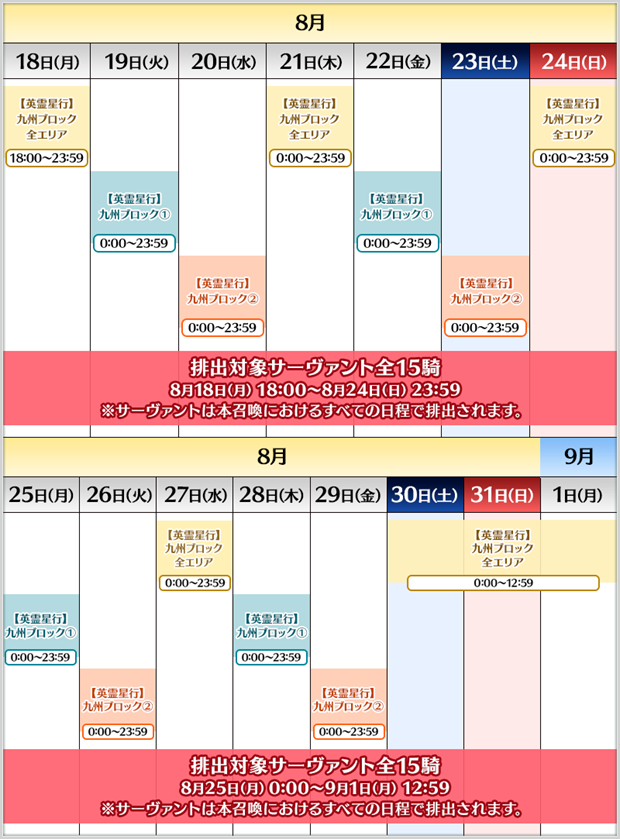 「Fate/Grand Order」10 周年を記念して実施している記念企画「OVER THE SAME SKY」。その描き下ろしイラストのうち、「九州」ブロック16種類の特別概念礼装「英霊星行」をピックアップする3種類の召喚を開催する。また本召喚は日替り開催となり、特別概念礼装のピックアップ対象は日ごとに切り替わる。さらに本召喚では、各概念礼装に描かれている、配布サーヴァントを除くサーヴァント15騎のみが排出対象となる。