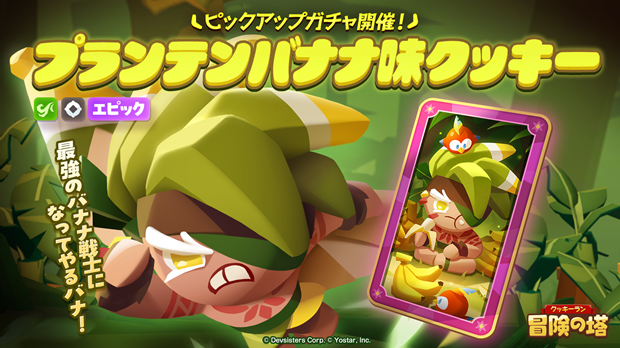 株式会社Yostar(代表取締役 李 衡達 / 所在地:東京都千代田区)は、デヴシスターズ(株)(代表 チョ・ギルヒョン / 所在地:韓国ソウル市)が開発する「クッキーラン」シリーズの新作スマートフォン向けゲーム『クッキーラン:冒険の塔』において、2025年8月21日(木) 14:00 より、「プランテンバナナ味クッキー」のピックアップガチャを開催する。また「タワーパス シーズン6」を開催する。