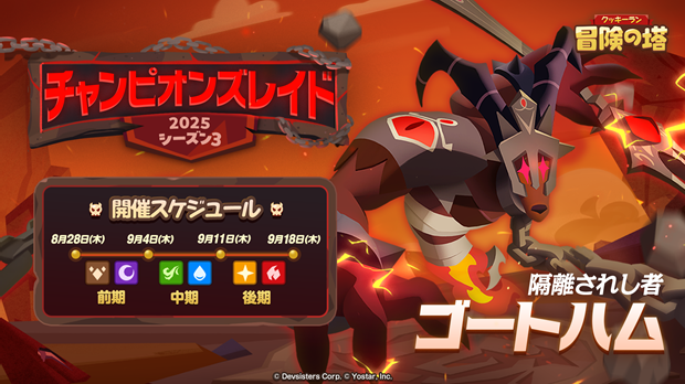 6人で力をあわせて立ち向かえ!ボス「“隔離されし者” ゴートハム」が登場する、「チャンピオンズレイド」の2025-シーズン3を開催する。開催期間中に獲得した累積スコアに応じて「チャンピオンズメダル」を獲得。「チャンピオンズメダル」は、交換所にて装備「永遠の大奇術師」「上級属性潜在能力秘伝書(属性ランダム)」などと交換できる。