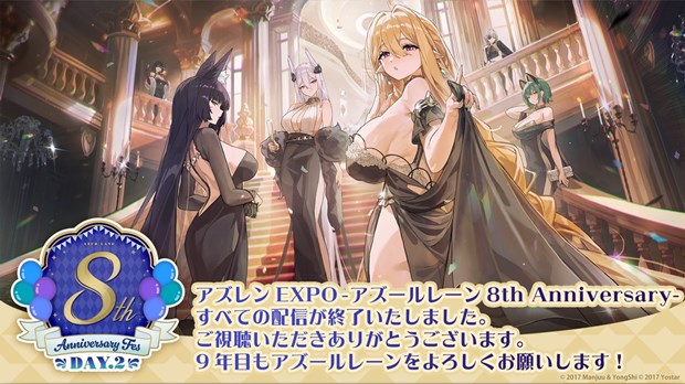 最後はコスプレイヤーとまんじゅうが勢ぞろいした。登壇者からは、二日間があっという間に駆け抜けたような気がした。去年は暑かったが今年はみなさんの熱気を感じれた。フィギィアとkを見て指揮官さんが楽しんでもらえるのがアズレンだな、と改めて感じた。皆さんと記念すべき8周年を祝えたのがうれしかった。指揮官の皆様には引き続きアズレンを支えていってください。最後は社長が登場! 2年ぶりに秋葉原に戻ってきて、YoStarは秋葉原を拠点として仕事をしているが、今まで見てきた秋葉原とちがう、異空間、異世界、指揮官の皆様があふれている秋葉原が私たちのいる場所だと語った。当初は6人でスタートしたが、当時はどう見積もってもここまで来るとは思っていなかった、と本心を語る。目指しはします、と語り、もう10年も見えてくるんじゃないか、と語ると会場から歓声が沸き起こった。これから引き続き素晴らしいコンテンツを提供できるように頑張りますので指揮官の皆様サポート熱気をください!皆様がいることのアズールレーンです!との言葉で締めた。
