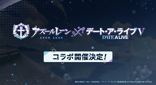 『アズレンEXPO -アズールレーン 8th Anniversary-』内ステージとして2025年9月6日(土)に実施された生放送番組「アズレン公式生放送DAY1 〜祝8周年!新情報解禁SP〜」にて、『アズールレーン』とTVアニメ『デート・ア・ライブV』とのコラボを開催することを発表した。コラボ詳細は今後、アズールレーン公式X(@azurlane_staff)やゲーム内のお知らせなどで公開とのこと。続報にご期待ください!