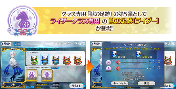コマンドカードの強化に使用する「獣の足跡」にクラス専用のアイテムを追加。クラス専用の「獣の足跡」は対応するクラスのサーヴァントにのみ使用でき、通常の「獣の足跡」と同様の効果を得ることができる。
