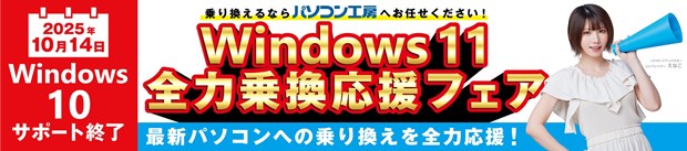 2025年10月14日(火)サポート終了まで残り1カ月となりましたWindows 10搭載パソコンからの乗り換えはパソコン工房にお任せ。全国のパソコン工房 店舗・WEB通販サイトにて、お使いのWindows 10搭載パソコンから最新Windows 11搭載パソコンへお得に乗り換えを行っていただける『Windows 11 全力乗換応援フェア』を実施中。
