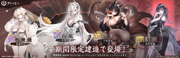 株式会社Yostarは、当社が運営しているスマートフォン向けアプリ『アズールレーン』において、2025年9月12日(金)のメンテナンス後より、期間限定イベント「アマハラに舞い奉れ」を開催。またあわせて、UR空母「白鳳」、SSR「近江」、SSR「浅間」たち重桜の艦船が新登場する期間限定建造や、着せ替えアイテムの新規追加・復刻販売等も実施する。