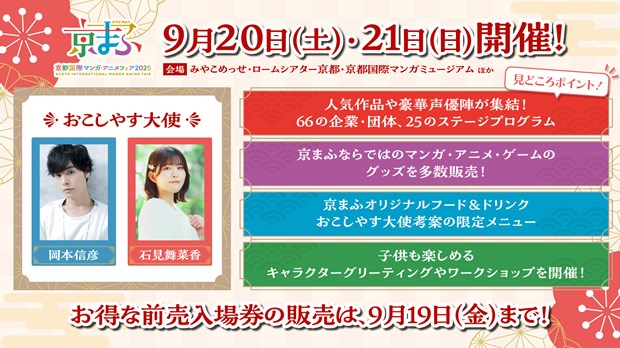 京都国際マンガ・アニメフェア実行委員会は、いよいよ来週末の2025年9月20日(土)・21日(日)に、みやこめっせ、ロームシアター京都、京都国際マンガミュージアムで、西日本最大級のマンガ・アニメ・ゲームのイベント『京都国際マンガ・アニメフェア(京まふ)2025』を開催する。2日間で全25にもなるステージイベントや、京都の伝統産業に関連したワークショップなど、注目の企画が盛りだくさん!