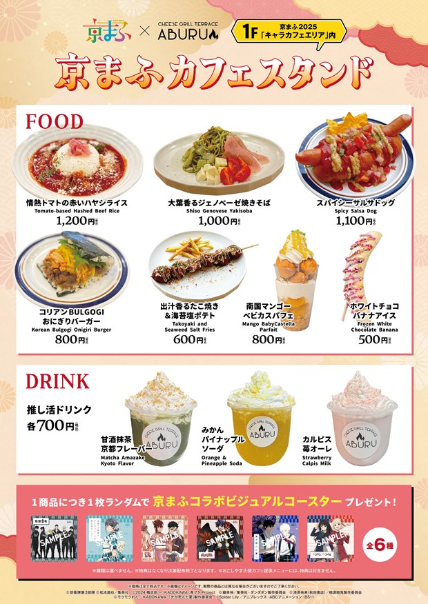 みやこめっせ1階 第2展示場内の「京まふカフェスタンド」では、京まふオリジナルフードとドリンクを提供。また、対象メニューをご購入いただいた方に、1商品につき1枚ランダムで“京まふコラボビジュアル”のコースターをプレゼント!
