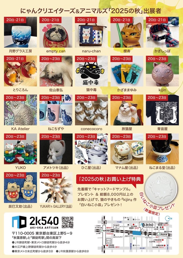 猫をはじめ、さまざまな動物たちをテーマにしたアート作品が一堂に集まる展示販売会が2025年9月20日(土)~23日(火)まで秋葉原の2k540にて開催! 絵画・イラスト・クラフト・Tシャツ・雑貨など、多彩なクリエイターが「いきものの魅力」を表現する。