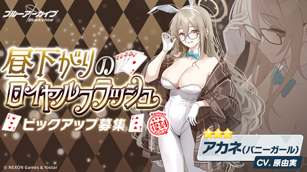 2025年9月17日(水)11:00より、復刻ピックアップ募集「昼下がりのロイヤルフラッシュ」を開催。バニーガール衣装を纏った「アカネ(バニーガール)」さんのピックアップ募集になる。