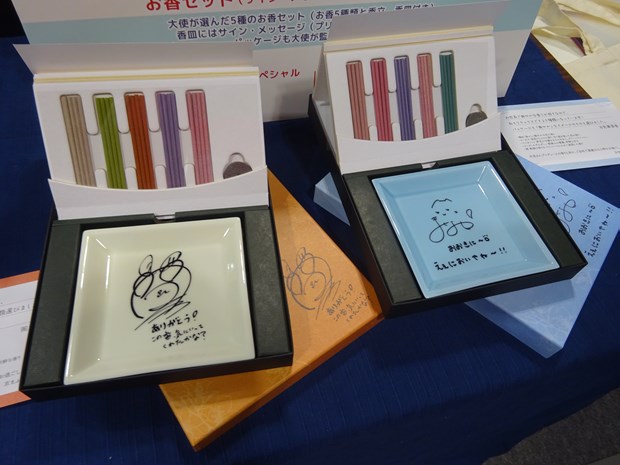 こちらがオープニングステージで大使のお二人が持っていた返礼品のお香のセット。リアルで確認できるので是非見に行こう!