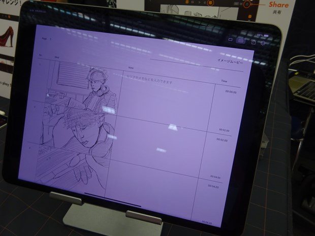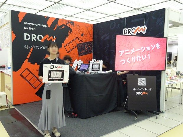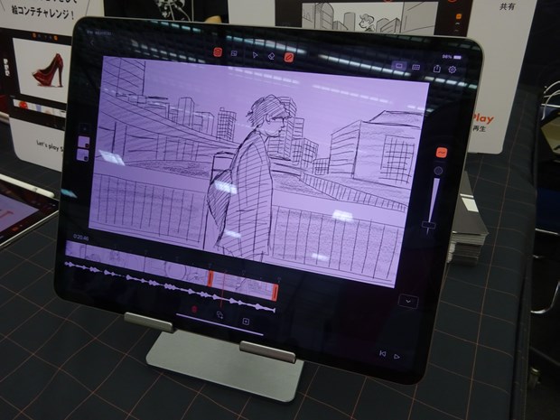 今回気になったブースは2か所。一つは絵コンテが動くアプリのブースだ。こちらDROMIというアプリだが、絵コンテとその動画再生がボタン一つで切り替えられて連想している。絵コンテでタイムラインを決めても、実際にセリフが入りきれないなどがあるだろう。そんなときの簡易チェックとして非常に便利なアプリになっている。