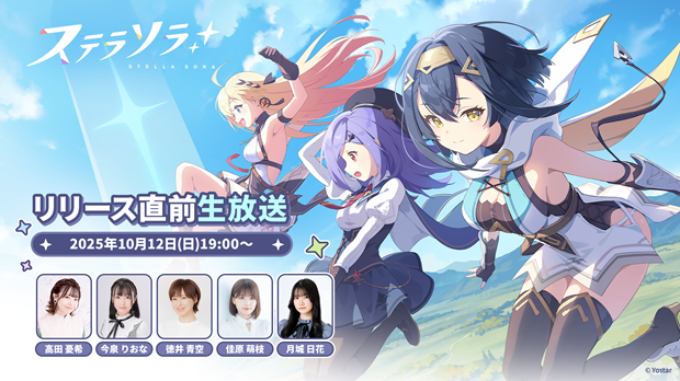 株式会社Yostarは、新作スマートフォン/PC(Windows)向けゲーム『ステラソラ』において、初の公式生放送「『ステラソラ』リリース直前生放送」を、2025年10月12日(日)19時より作品公式YouTubeチャンネルおよび作品公式X(旧Twitter)にて配信することを発表した。