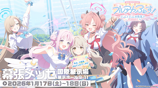 株式会社Yostarは、アプリゲーム『ブルーアーカイブ -Blue Archive-』(開発:NEXON Games社)において、 2026年1月17日(土)~1月18日(日)に、リリース5周年を記念したリアルイベント「ブルアカふぇす!~ごー!ごー!!先生♪~」を、幕張メッセ 国際展示場 展示ホール9〜11で開催することを決定し、同イベントの特設サイトとキービジュアルを公開した。あわせて、「入場券(先行抽選)」の抽選受付を開始した。(ブルーアーカイブ5周年記念特設サイト:https://5th-anniversary.bluearchive.jp/)