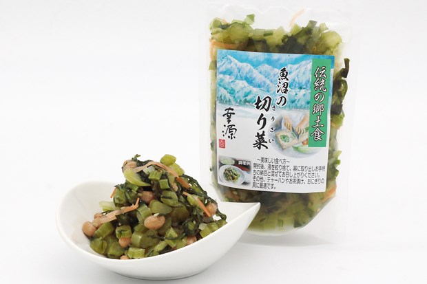 野沢菜漬を細かく刻んで野菜と合わせた魚沼地域の郷土食。八海山水系の伏流水と煮干醤油が味の決め手。納豆と和えて食べるのがおすすめです。