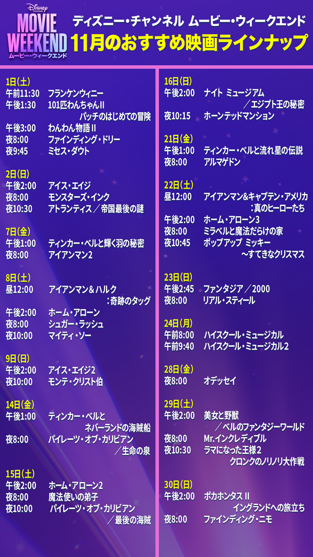 全国のケーブルテレビおよび衛星放送(BS/CS)で放送中のディズニー・チャンネルは、毎週末大ヒット映画を楽しめる2025年11月の「ムービー・ウィークエンド」のラインナップを解禁!この機会にぜひディズニー・チャンネルで楽しもう!